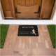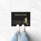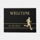 金ゴールドシルエットランナーがこのドアマットの右下にあります。細い金ゴールド線は、一致する金ゴールドにファミリ名やその他のカスタム文字文字を構成し、カスタマイズ可能なトップフィールドは現在WELCOMEと表示されています。イメージと文字は黒い背景に配置されます。