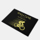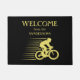 金ゴールドシルエットの自転車乗りは、このドアマットの底でスピードを落とします。自転車乗りのイメージの上には、文字「ようこそ」とあなたの姓があります。全ての文字カスタマイズは好きなものに簡単に届く。イメージと文字は黒い背景に配置されます。自転車好きな家族にぴったり!