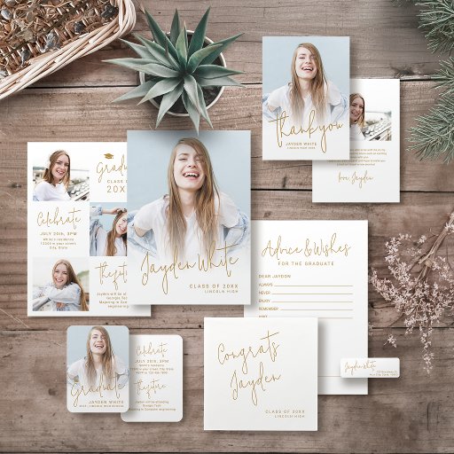 2枚のモダン写真と感謝のノート、金ゴールドとおもしろいシンプル、卒業式パ素晴らしーテパーソナライズされたィのためのサンキューカード付きスクリプト。