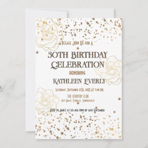 第50回バースデーパーティーへの招待。白と金ゴールドのデザインはスクリプトスタイリッシュとスターダストの紙吹雪を特徴とする。