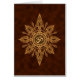 オウムまたはOmの記号は精巧な太陽のデザインのの中に坐ります。 星は中心の円からのスポークのように広がる8つの様式化された光線から成っています。 複雑なラインおよび点はパターンに表面の軽い輝やきを与えるために強調される金黄色と着色されます。 背景は日曜日の否定的な宇宙を通して見ることができる絵を描かれたこげ茶です。 影はそれを作るデザインの下でちょうどカードの表面の上でちょうど浮かぶようです現われます。 このスタイリッシュなデザインはこの精神的な記号の顕著な表示です。