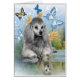 青空および多彩な蝶の背景幕に対して提起されている間彼の反射を崇拝する銀製のプードルの素晴らしい挨拶状。