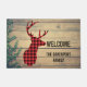 素朴なパーソナライズされたスタイルで名前を付けた歓迎の形式。鹿の頭と〔雄ジカの〕枝角で設計され、赤い格子模様で作られる。木の板と緑のツタのイメージ葉が背景には、外に出す与えような国感じ々である。