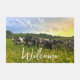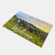 このWelcome doormatは、背景に明るい黄色の雑草と部分的に荒れ模様の灰色の空が背後の夕日と混ざった有刺鉄線フェンスの後ろに立っている白黒のスペックルパーク牛の列を特徴としている。