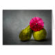 赤いカクテルの傘の後ろにある2つの梨のクローズアップ。水が滴のまわりにる。空は灰色で天気は荒れている