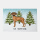 可愛いローデシアン・リッジバックのデステイのオリジナル漫画のイラストレーション。3本の緑のモミの木と降り積もる雪が積もった冬のシーンに犬を置く。背景は青から白のグラデーション与えのデザインは、寒い冬の日に見える。名前にはパーソナル化可能な文字領域もある。