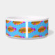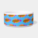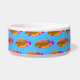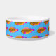 この楽しい犬用ボウルは、直線アートの背景と美しい海の青に、明るいオレンジとピンクのトロピカルフィッシュを特徴としています。