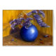青いつぼおよび金ゴールドの背景の紫色の花