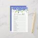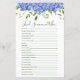 この美しい青いアジサイ誰かを見つける…ブライダルシャワーのゲームシートはエレガントと – 任意の庭魅力的園、植物性、素朴、ロマンチック、フローラ、またはヴィンテージの結婚式に最適フォーマル。優美な色合いの青い数々のアジサイと賢い緑の絶妙な組み合わせは、花々と繊細で美しい。このおもしろいと簡単のゲームは間違いなく笑いをもたらすあらゆるブライダルシャワー!必ず氷が割れて皆が話したり笑ったりするだろう。単に与え各ゲストにシート(ペ忘れンを使わない)を設定し、5分間のタイマーを設定し、おもしろいを開始する!多くの人が同じような人生の経験を共有することに驚くだろう。