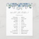 ブライダルシャワーのゲームカードは、青い花模様の水色カスケードを特徴とする。シャワーおもしろいと交流する方法。