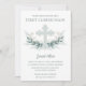 このモダン最初の聖餐式の招待は青いクロスと水の色のエレガントと花の芽を備え、あなたの息子の特別な機会に理想的である。MATCHING製品は当店で利用可能。