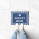 青と白の犬の家のドアマットに足の文字や足の文字や大きな白い文字の犬の名前が付いています