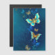 金ゴールド、飛んでいるジュエリー蝶の青いテクスチャの背景。デザインと蝶。