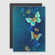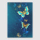 金ゴールド、飛んでいるジュエリー蝶の青いテクスチャの背景。デザインと蝶。