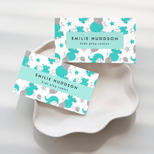 青い象や風船、星を持つ可愛くておもしろいで愛らしい名刺。そしてモダントレンディーデザイン、完璧なセ子供へン遊ト、遊び場、アクティビティの中心、子ども、気にbabysitter、nannies。
