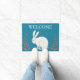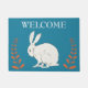ダークブルーの背景に背の高い葉のエレガント多いオレンジ色の植物の間に座っている白いウサギを持つ屋外ウェルカムドアマット。カスタマイズテンプレートのウェルカム文字。