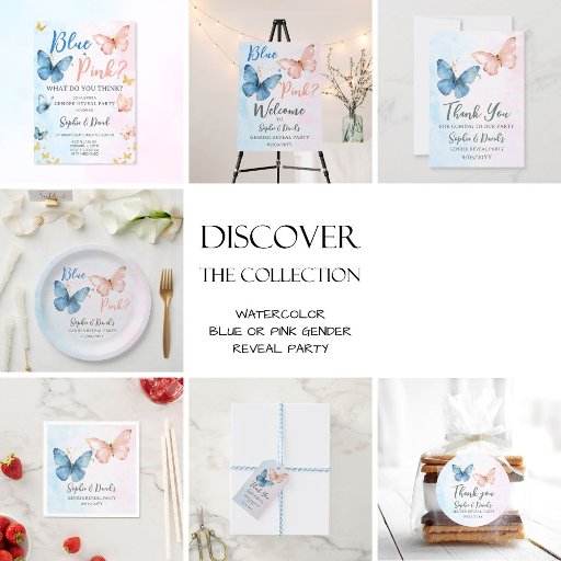 青またはピンクの性別が赤ちゃんシャワーパーティーギフトラベルを明らかにする。この可愛い男の子または女の子のジェンダーを明らかにする赤ちゃんシャワーメッセージカードデザインは水色の蝶を特徴とする。