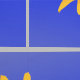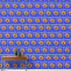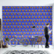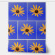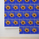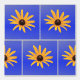 このデザインは、青い四角いタイル模様の上に太陽のように輝く黄色い黒い目をしたデイジーの花のクローズアップ写真を掲載している。特別なリクエストや質問の場連絡合は、 wafadahdalcreates@gmail.comのアーティスト。© Wafa Y. Dahdal – 全著作権所有。WDアート