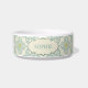 背景にクリームスタイリッシュとグリーンとアクアブルーのヴィンテージの花模様を付けた陶磁器製の猫丼。真ん中には、子猫の名前を簡単にカスタマイズティール(緑がかった色)ブルーで名前を付け書ることができる場所がある。