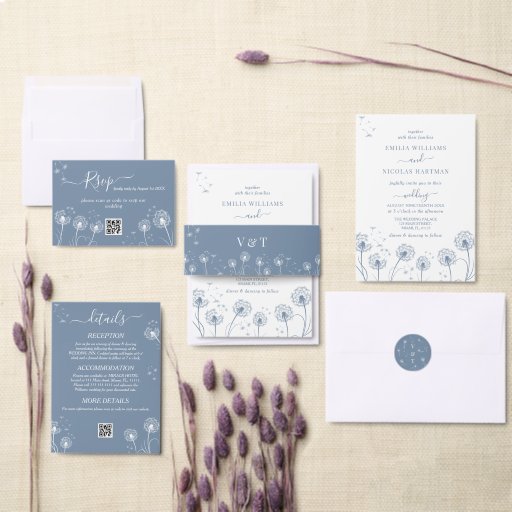 ペリウィンクル・ブルー・ウェディングのご招待素朴なボホ招待野花結婚病春夏秋冬ケシのタンポポ草花青と白シンプルミニマル結婚式招待状エレガントフォーマルアクリルお洒落澄ん招待状