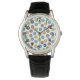 このメンズウォッチは、青、緑、茶色のドットの幾何学的デザインを持つ。