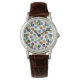 この女性時計は青、緑、茶色のドットの幾何学的デザインを持っている。