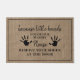 "小さな手のtouch私たちの床で靴を取り除くドア"黒でハンドプリントイラストレーションのバーラップの背景の上インスパイアに。