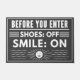 靴を脱いでスマイル!このフォーマットは、スタイルと機能を組み合わせている澄ん:クリーンな床のためのメッセージは、ユーモアのtouchとモダンデザインにパッケージされている。ミニマルフォントスタイルは、暖かさとポジティブさを加える明るい太陽によって補完される。あなたの家の色に合わせてカスタマイズ可能な任意の玄関に最適なこのマットは、あなたとあなたのゲストを整頓し、良い気分で – または友人や家族のためのギフトとして。