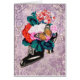旧式な女性靴は花で精巧にとまられて蝶がゼラニウムのかわいらしい花束を、備えています。 背景は軽いダマスク織パターンとのラベンダーの色です。 アンティークは、バロック式の渦巻側面を飾ります。