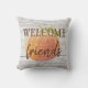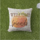 「WELCOME friends」引用文文字とオレンジ色のカボチャをヴィンテージに織り込んだ木製の板のパターン背景を持つ可愛い屋外枕。感謝祭のお洒落休日の装飾のアクセント飾は、あなたのファームハウスのポーチ、パティオまたはベランダの前か後ろポーチ飾、スタイルの国のコテージ、ログキャビン、素朴な湖の家や居心地の良い川のリトリート。