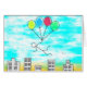 風船を使って街を飛ぶ漫画のキャラクター。デジタル画像。