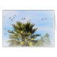 ヤシの木の上で高く飛んでいる鳥。 背景の青空。
