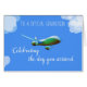 緑の飛行機が空飛んでいるに浮かび、それとともに幸せな飛行機の日を願っている。このカー祝ドは養子縁日に特別な人の贈り物だ。