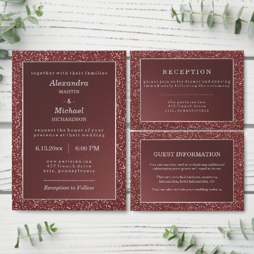 この華やかな結婚式招待状はマルサラのグリッター縁どの外観と、フレーム内の銀色を特徴としている。あなたの結婚式招待状の言葉はモダン銀色の文字だ。ご注意:グリッターとスパークルのデザインは印刷されており、これらの招待状では実際の物理的グリッターは使用されていない。完全なマッチの結婚スイートを見るクリックには、以下のコレクションの写真を見て下さい。