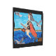 黒い水着の中に星の付いた魔女おもしろいと、海の脇の箒の横に黒猫のケープを置き飛んでいる、その後ろの箒に黒い波打った背景にぶら下がったは、その金属壁のプリント。