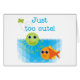 カラフルでお洒落なおもしろいのTシャツ、ボディスーツ、マグ、mousepads、およびより多くの"ちょうど余りにかわいい!"読む青および文字の海の金ゴールドの魚そして緑のタコを特色にすること。