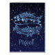 深いミッドナイトブルーからブラックに格付けされた星空の背景に対して、星座の星で覆われた柔らかいシルバーブルーの魚座のための〔占星術の〕十二宮図のシンボルをフィーチャーしたカード。