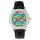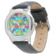 この子供用の時計は、海の中で緑、青、オレンジ、黄、赤、ピンク、青と緑の魚の群れのデザインを持っている。