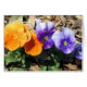 鮮やかなオレンジおよび青のすみれ色のパンジーは落ちたな紅葉を通って春に咲きます。