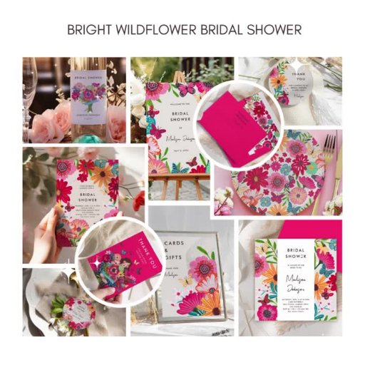 モダン ボーホー ブライト ワイルド フラワーズ ボヘミアンブライダルシャワー。 明るいピンク、オレンジ、赤、黄色、青、緑の色合いを特徴とする、ワイルドフラワーと水彩の素朴なモダンな庭園に触発された植物の花。繊細なグリーンとモダンなミニマルなスクリプト タイポグラフィーがベージュの背景に施されています。カロライン ボンヌ ミュラーによるオリジナルの手描きアートワーク。