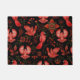 詳細な模様の鮮やかな赤い鳥が黒い背景に配置され、複雑な花と葉のデザインに囲まれて、生き生きとした装飾的なシーンを作り出している。