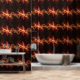 赤とオレンジの音波の印象的な視覚と流れる線とエネルギーパルスは、暗い背景に対してリズムと動きの感覚を作成する。