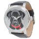 黒い芸術的ラブラドール犬の鮮やかなポートレートは、赤い襟を付けた表現豊かな目を持ち、穏やかな表情とニュートラルな背景に印象的な外観を強調。