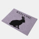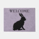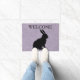 マーブル模様のライトパープルに黒い座りウサギかわいらしシルエットを施した屋外ウェルカムドアマット。カスタマイズテンプレートのウェルカム文字。
