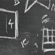 黒い黒板の壁の装飾に白い数荷車を引く字と数式。インテリアのソリューション。