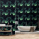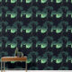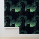 緑の目お洒落が白熱[赤熱]光を放つフェンスの柱に座り、三日月を背景に黒い猫