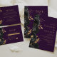 このデエレガントータカードを保存し縁どて黒い花と金ゴールドホイルフェイクの結婚式を特徴とする。暗カスタマイズ色の背景の金ゴールド色の文字。カードの裏は紫無地の色。