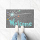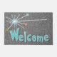 24"x36" Mid-Century Doormat灰色のグラフィック背景にレトロフォントで大きなティール(緑がかった色)"WELCOME"を持つ。スタイル化されたスターバストを含む。素晴らしミッドセンチュリーの入宅方法。