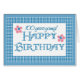 青と白かわいらしのチェックのギンガムパターンと2つのピンクの花を持つ100番目の誕生日カード。内側の挨拶を変更すもしることができる。