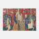 レディと一角獣ヒアリング(ラ・デイム・ア・ラ・リコルネ、ルーエ)中世タペストリー(1500年頃)。このタペストリーは6つのシリーズの一部である。それぞれのタペストリーは、様々なポーズの中世の女性を特徴としている。それぞれの場面は五感の一つ、そして六つ目の場面はモン・スル・デザー(私の唯一の欲望)と題される。